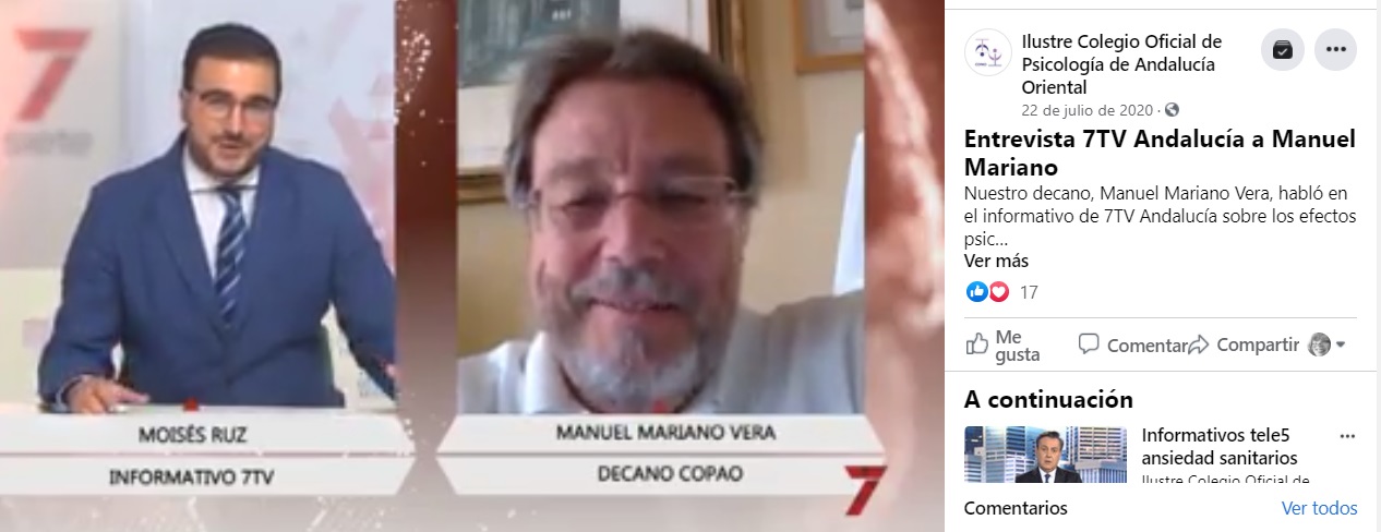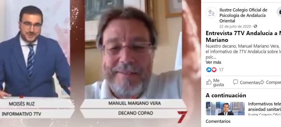 Colegio de Psicología de Andalucía Oriental por admin | Feb 7, 2021 | Noticias | 0 Comentarios Entrevista 7TV Andalucía a Manuel Mariano Manuel Mariano Vera, que habló en el informativo de 7TV Andalucía sobre los efectos psicológicos del calor. La entrevista completa aquí https://www.facebook.com/COPORIENTAL/videos/2599086203646339 Enviar comentario Cancelar la respuestaTu dirección de correo electrónico no será publicada. Los campos obligatorios están marcados con *Comentario * Nombre * Correo electrónico * Web Guarda mi nombre, correo electrónico y web en este navegador para la próxima vez que comente.