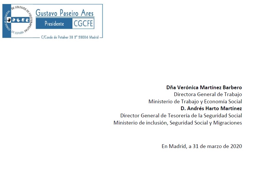 El CGCFE solicita que se aprueben los ERTES por fuerza mayor presentados por las empresas y centros de fisioterapia tanto a la Directora General de Trabajo como al Director General de Tesorería de la Seguridad Social.